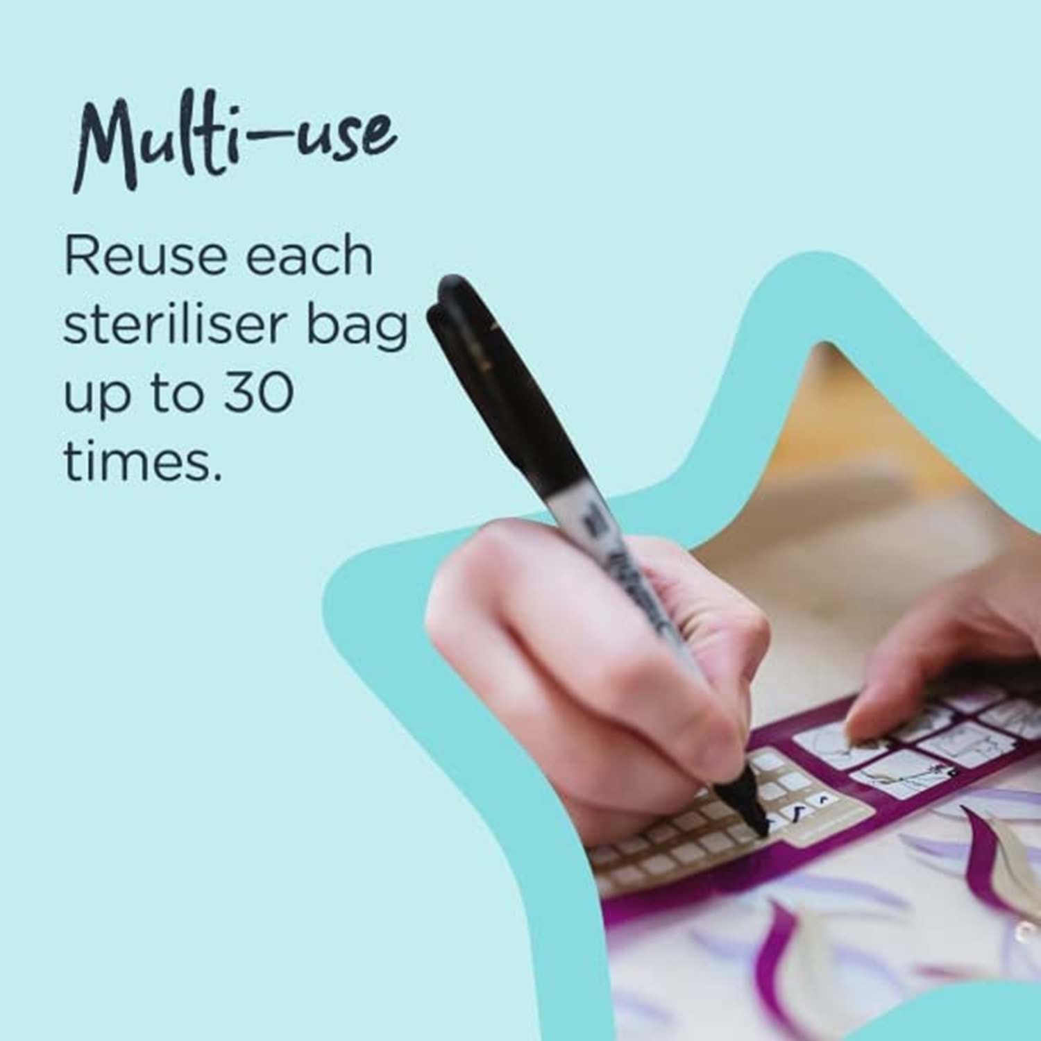 Torba başına 30 uygulama? Her sterilizatör torbasını 30 kata kadar tekrar kullanabilirsiniz, evde veya yolda süt pompaları ve bebek beslenme aksesuarlarını sterilize etmek için hızlı ve rahat bir seçenek