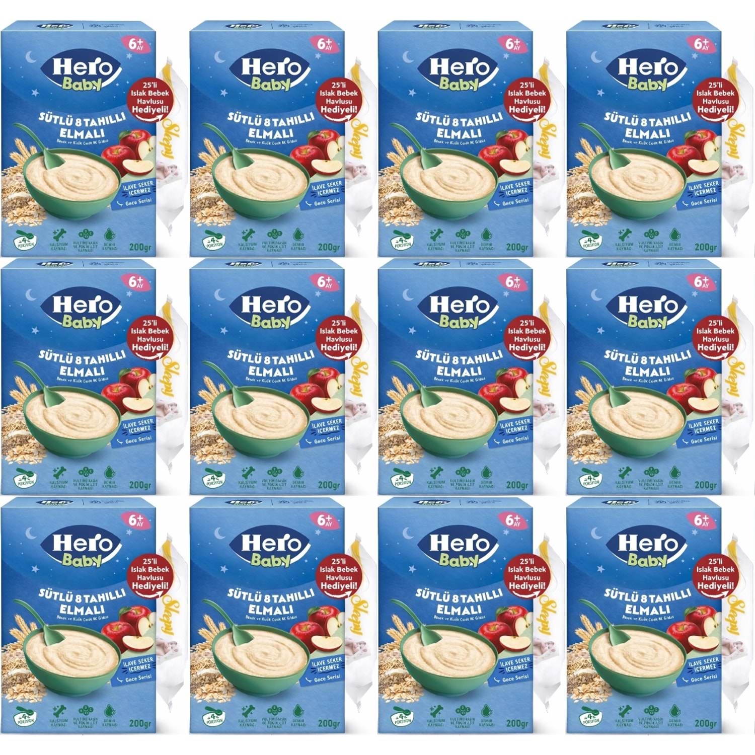 Hero Baby Kaşık Maması 200GR Gece Sütlü Elmalı 8 Tahıllı + Islak Mendil Hediye (12 Li Set)