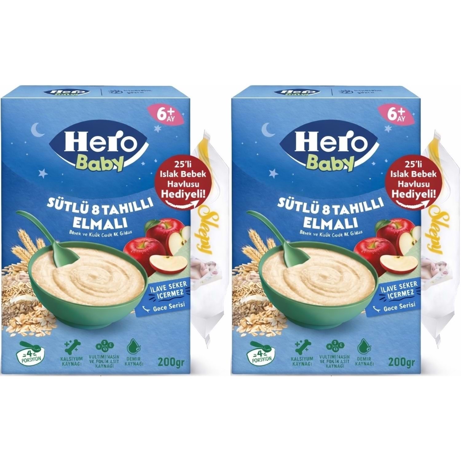 Hero Baby Kaşık Maması 200GR Gece Sütlü Elmalı 8 Tahıllı + Islak Mendil Hediye (2 Li Set)