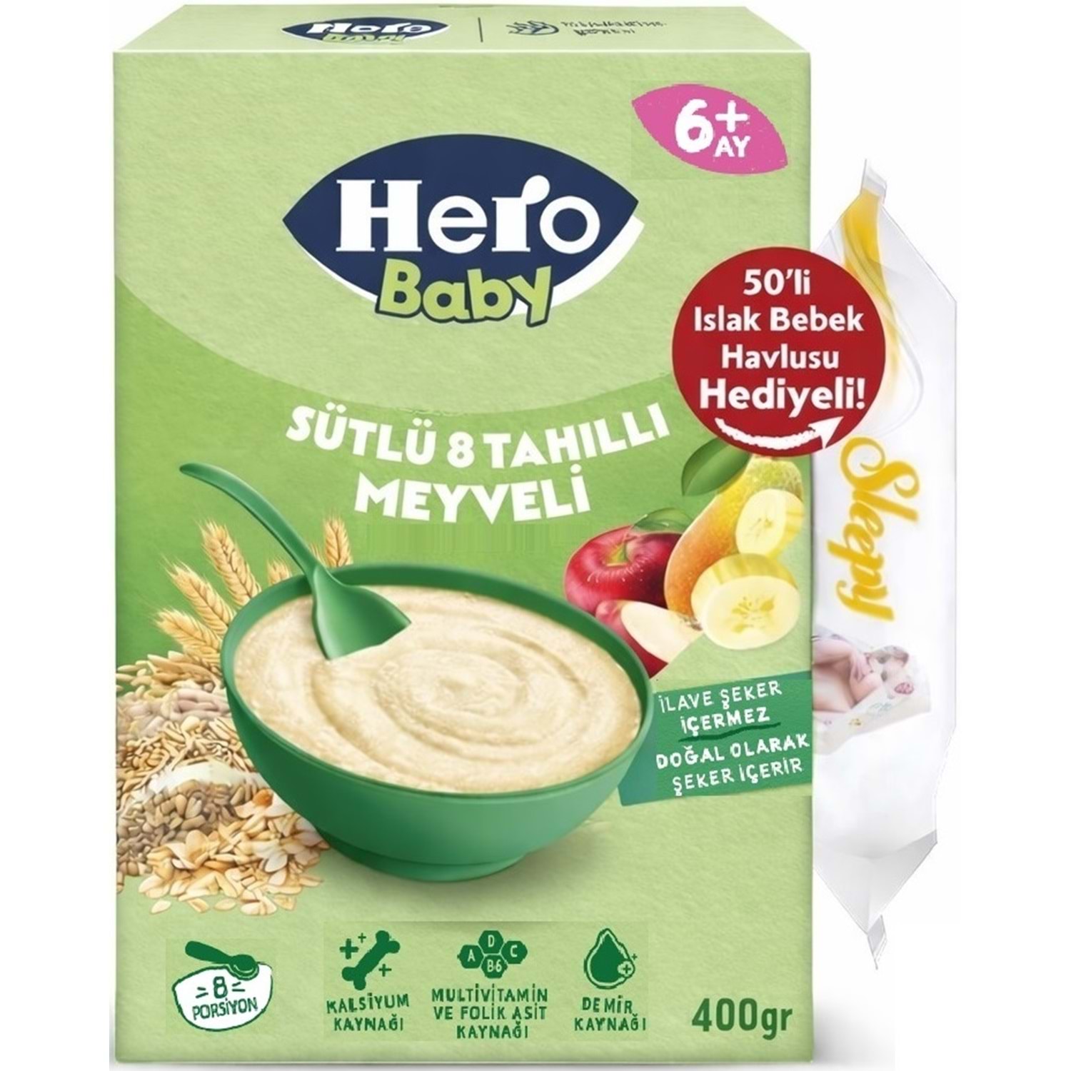 Hero Baby Kaşık Maması 400GR Sütlü 8 Tahıllı Meyveli + Islak Mendil Hediye