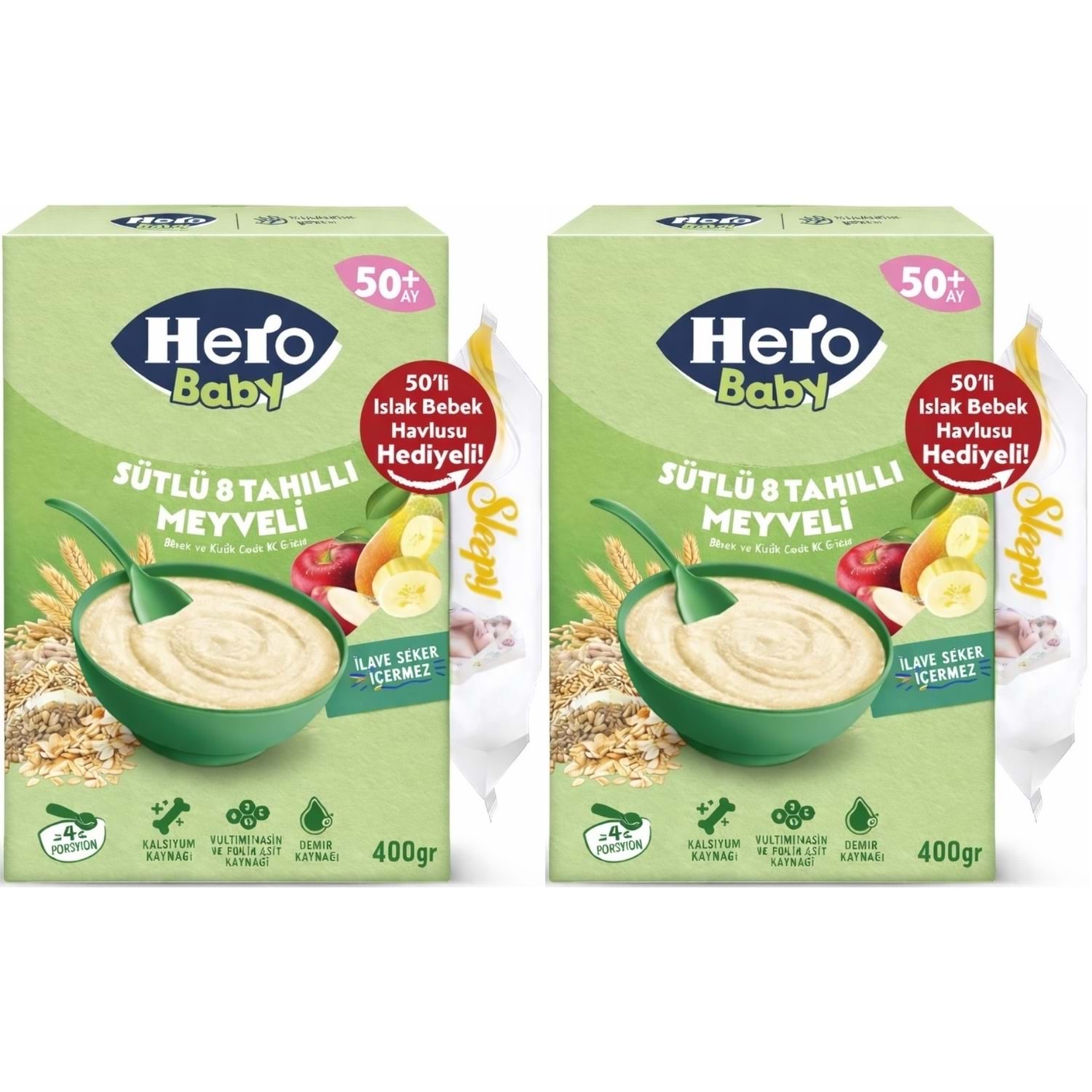 Hero Baby Kaşık Maması 400GR Sütlü 8 Tahıllı Meyveli + Islak Mendil Hediye (2 Li Set)