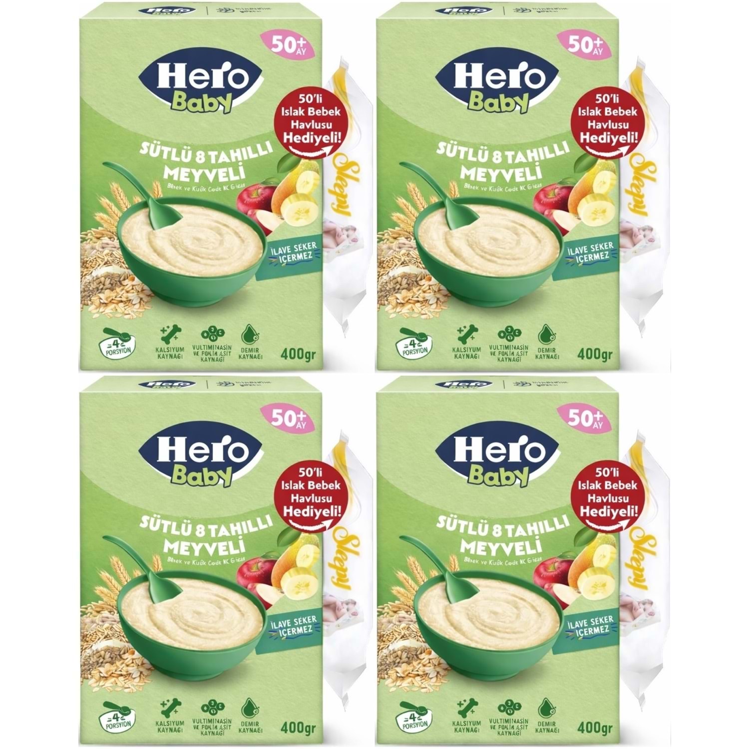 Hero Baby Kaşık Maması 400GR Sütlü 8 Tahıllı Meyveli + Islak Mendil Hediye (4 Lü Set)