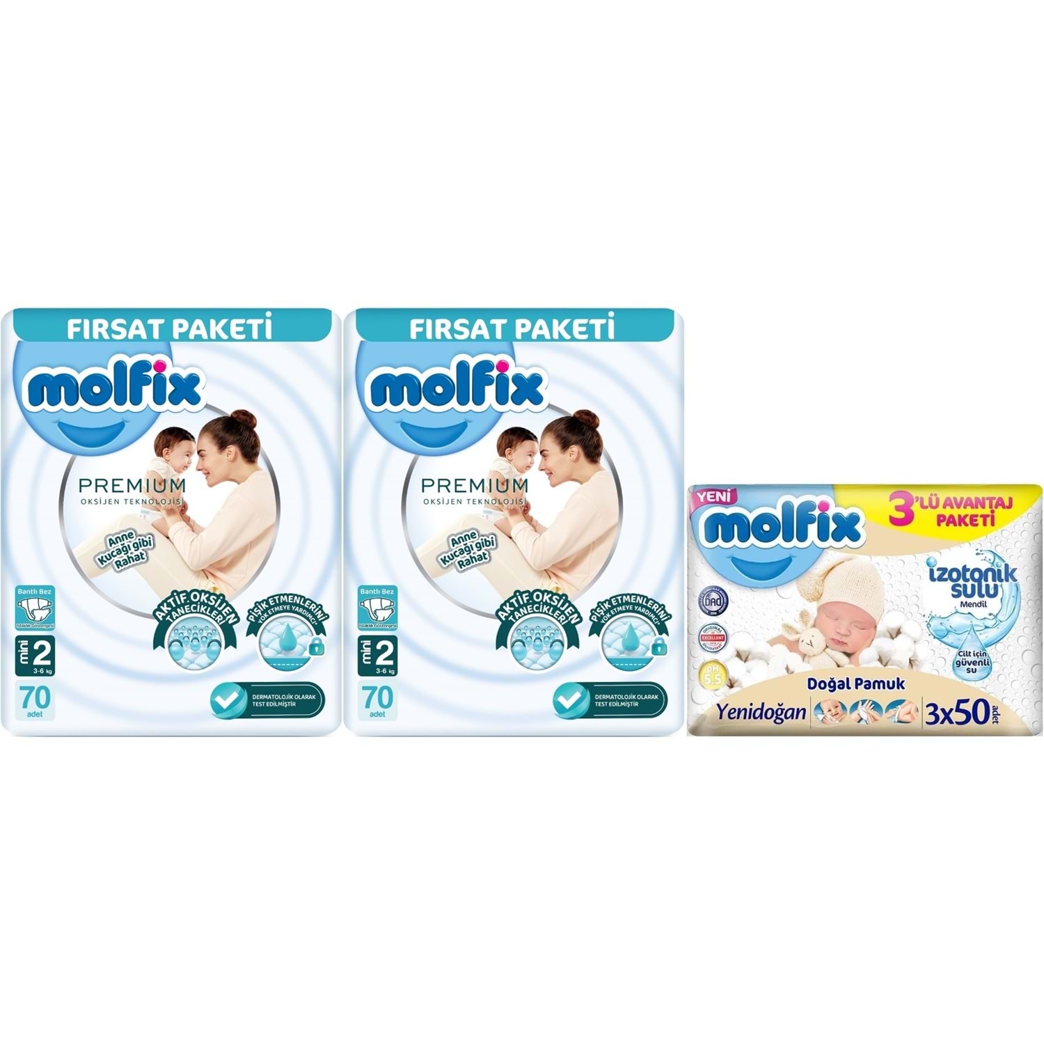 Molfix Premium Bebek Bezi Beden:2 (3-6KG) Mini 140 Adet Ekonomik Fırsat Pk + 3 Adet Islak Mendil