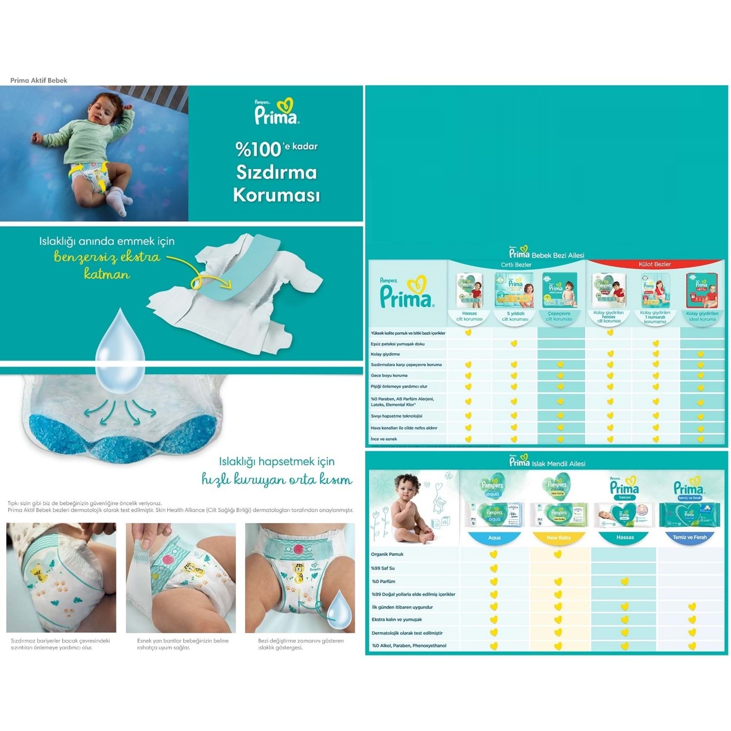 Bebeklerin her şeyi ne kadar derin hissettiklerini düşünün. Ciltlerindeki ıslak bebek bezinin nasıl rahatsız hissettireceğini hayal edin. Bu nedenle Prima ıslaklığı hemen emen benzersiz ekstra katmanı sayesinde 12 saate kadar kuru ve korunmuş cilt sağlar. Bebeğinizin cildini gece gündüz kuru ve rahat tutmanıza yardımcı olur. Tıpkı sizin gibi, Prima bebeğinizin güvenliğine öncelik veriyor. Prima Aktif Bebek bezleri dermatolojik olarak test edilmiştir.