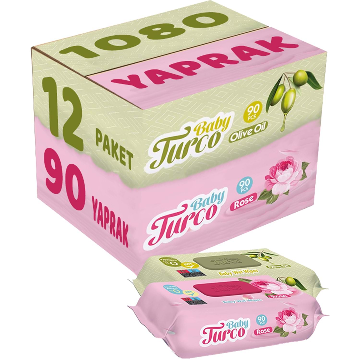 Baby Turco Islak Havlu Mendil 90 Yaprak Karma 12 Li Set (Gül/Zeytinyağı) 1080 Yaprak Plastik Kapaklı