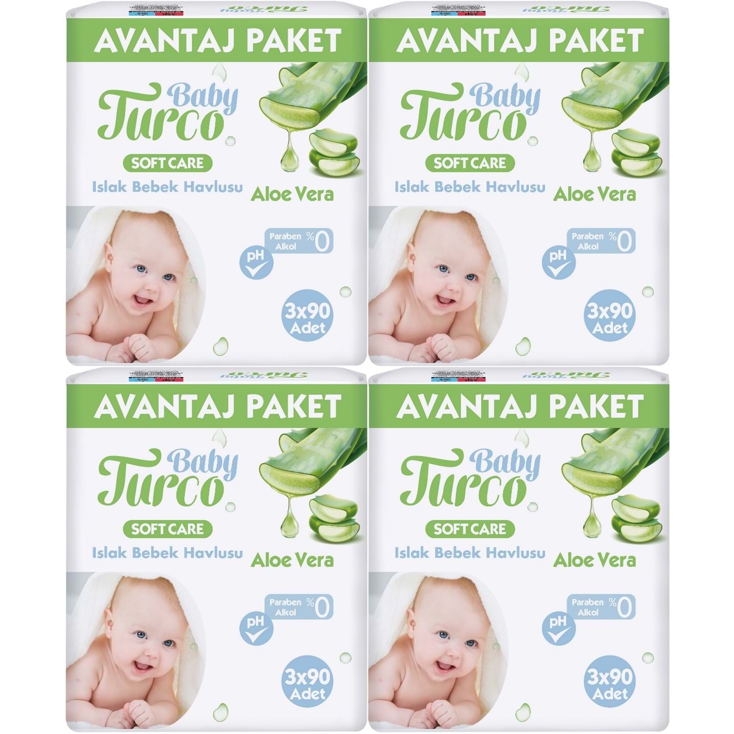 Baby Turco Islak Havlu Mendil Soft Care Aloe Vera 90 Yaprak (12 Li Set) (4PK*3) 1080 Yaprak Plastik Kapaklı