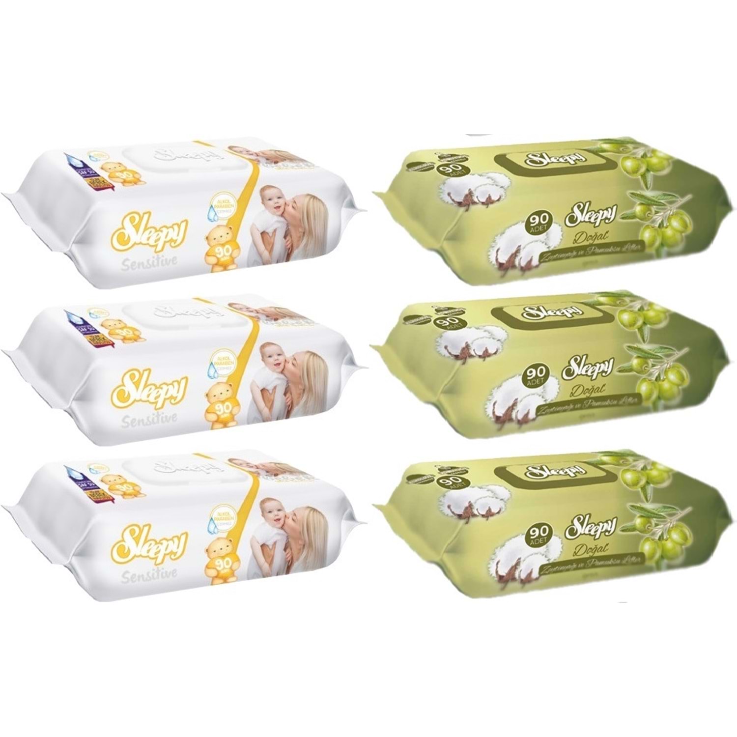 Sleepy Islak Havlu Mendil 90 Yaprak Karma (6 Lı Set) Sensitive & Pamuk-Zeytinyağlı 540 Yaprak