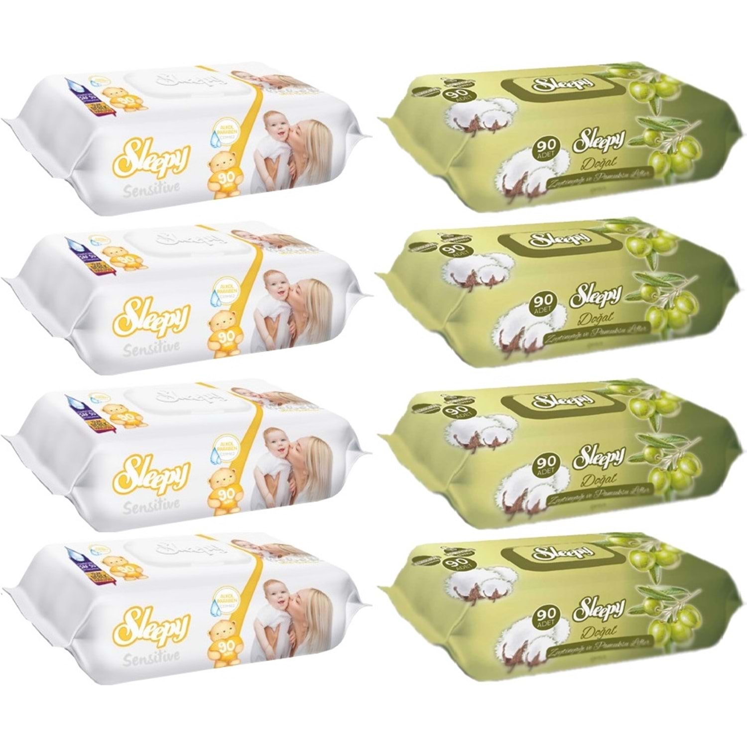 Sleepy Islak Havlu Mendil 90 Yaprak Karma (8 Li Set) Sensitive & Pamuk-Zeytinyağlı 720 Yaprak