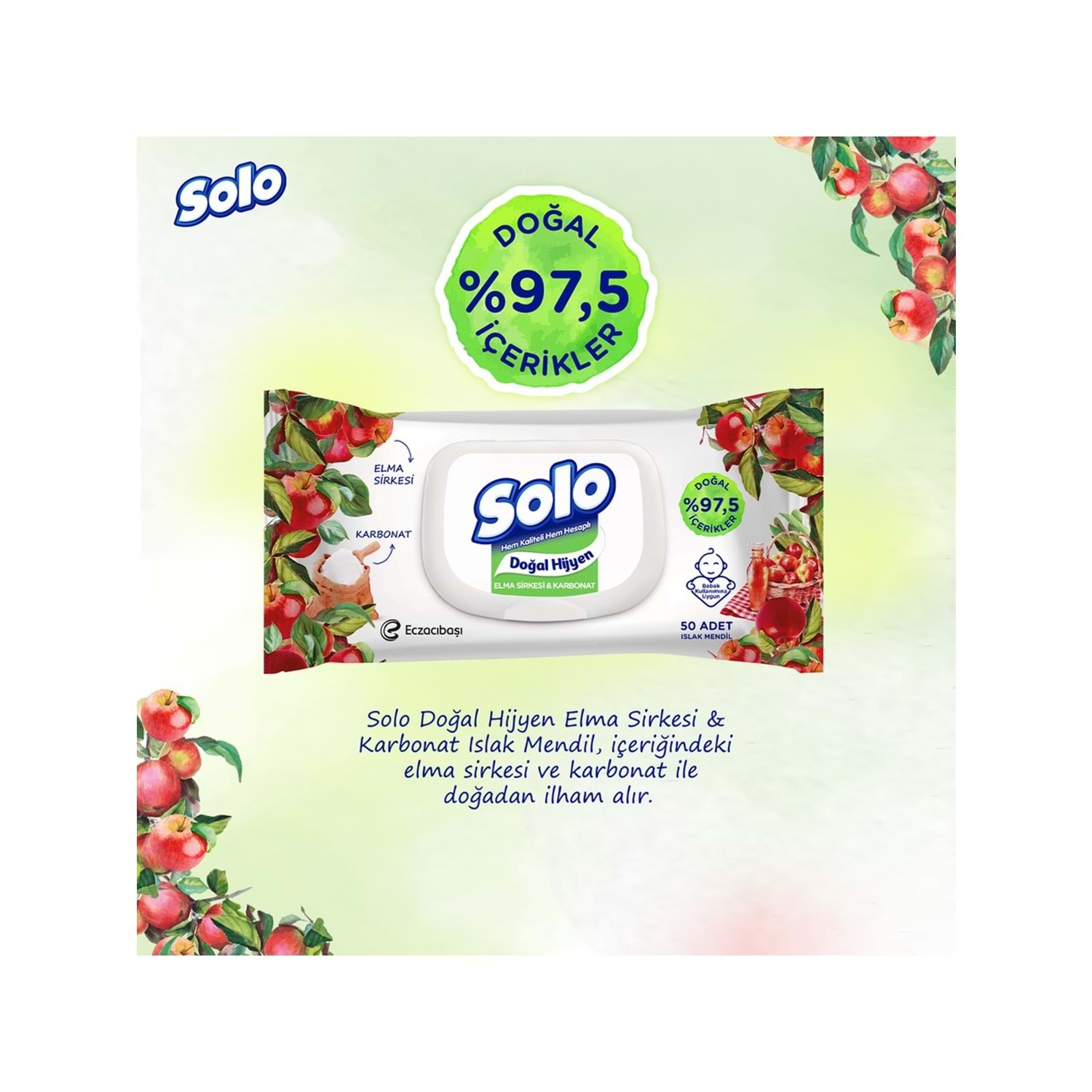Günlük hijyen ve ferahlık için Solo Elma Sirkesi & Karbonat Islak Havlu Mendil her an yanınızda!