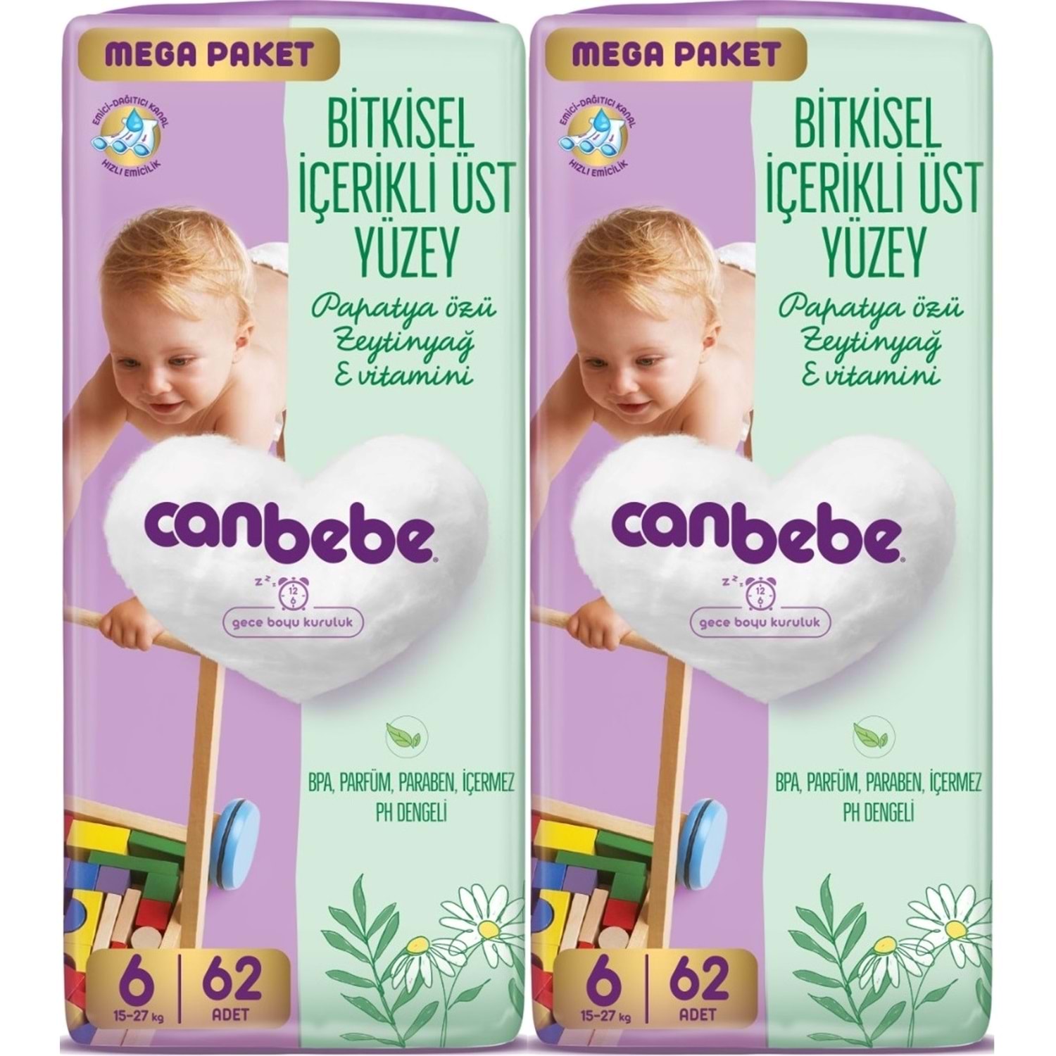 Canbebe hem sizin, hem bebeğinizin mutluluğunu düşünür. Uzmanlar tarafından geliştirilip ihtiyaçlarınız doğrultusunda yenilenir. Canbebe’nin amacı her zaman en iyi bakımı sunmaktır. Yeni Canbebe, emici-dağıtıcı kanalları sayesinde sıvıyı hemen emer, beze dengeli bir şekilde dağıtır. Canbebe’nin hızlı kuruluğu, annelerin onayını tabii ki alır. Sadece yeni Canbebe eşsiz yapısı sayesinde sızmalara karşı ekstra koruma sağlar.
