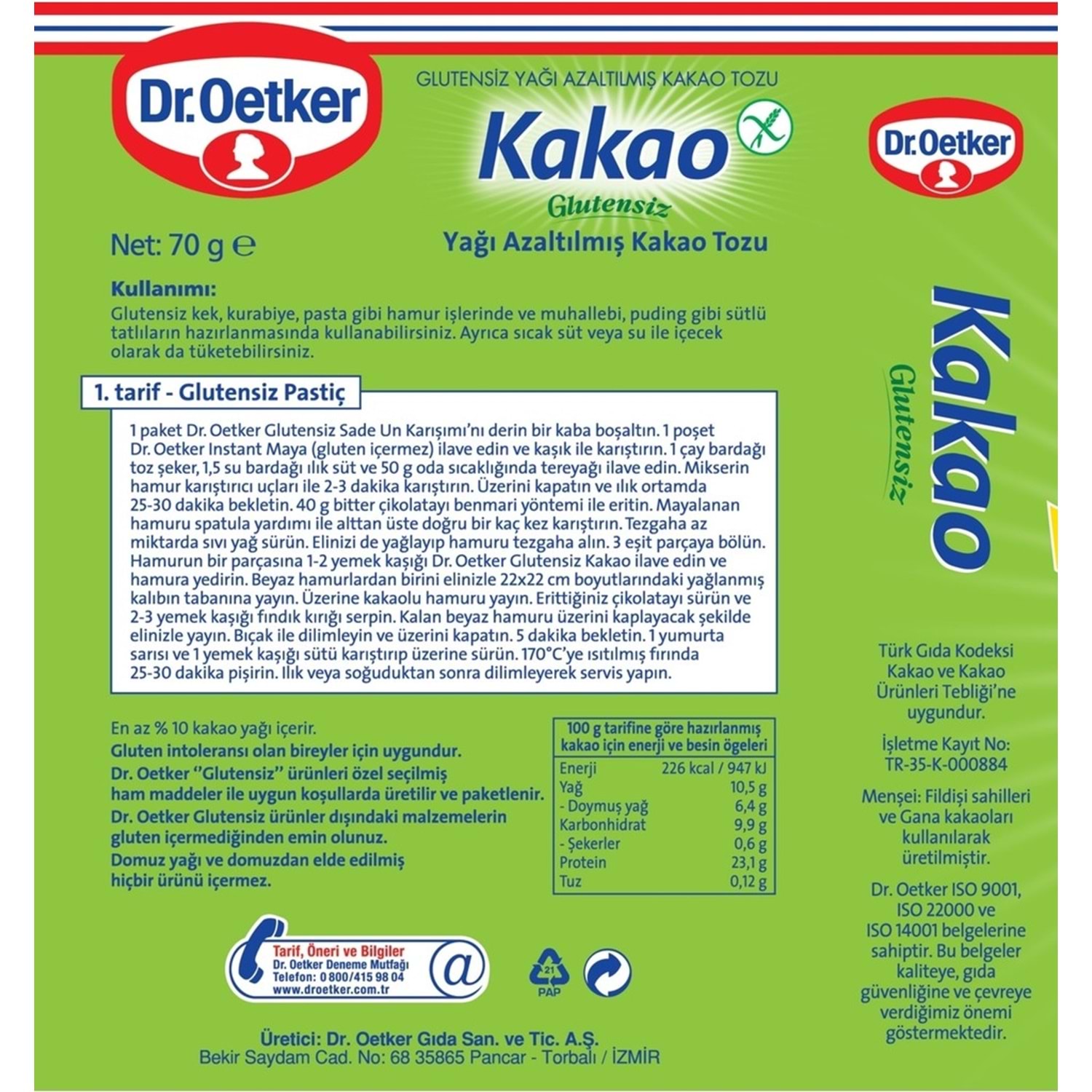 Dr. Oetker Glutensiz Kakao, yoğun aroması ve kaliteli kakao tadıyla kek, kurabiye, pasta ve sıcak içecek tarifleri için ideal bir üründür. Pürüzsüz kıvamı ve kolay karışabilir yapısı sayesinde tariflerde mükemmel sonuç verir.