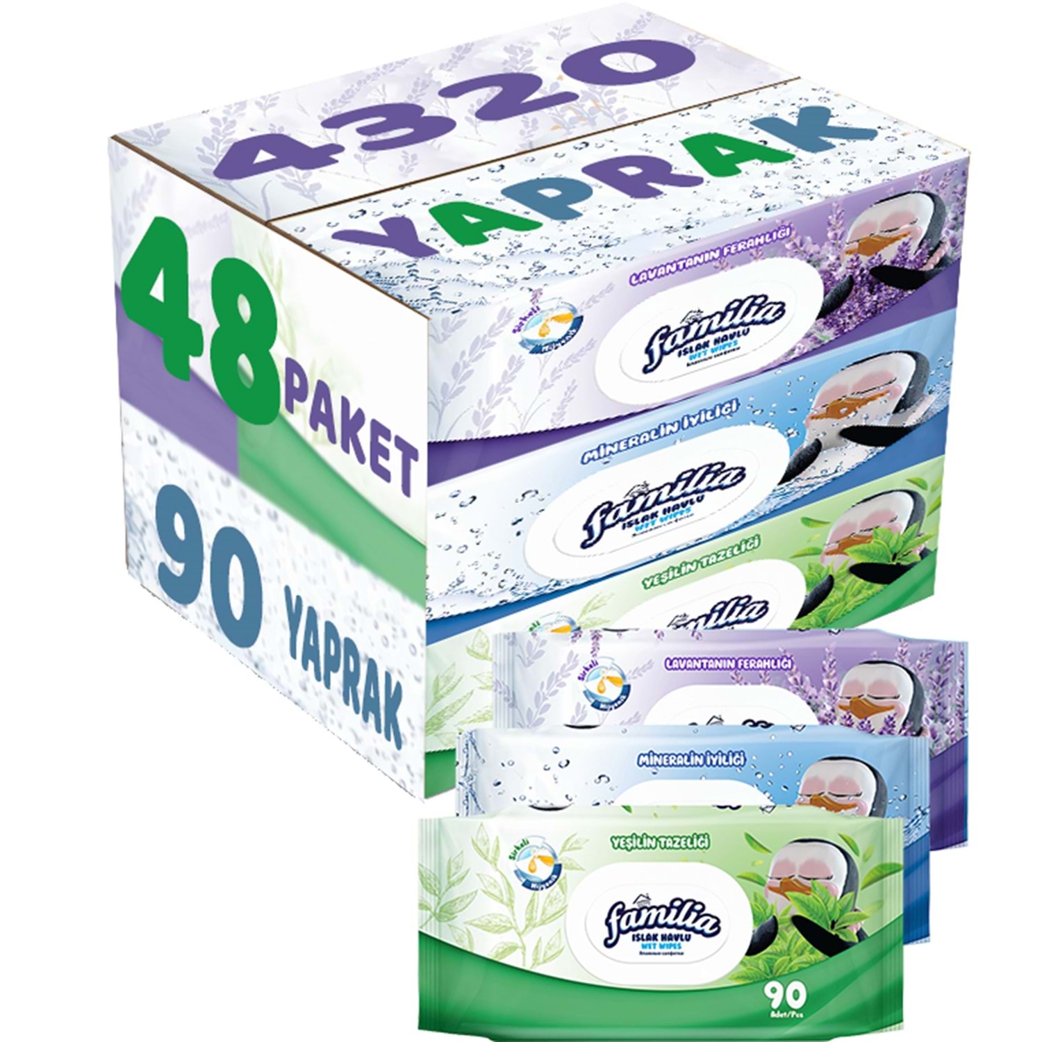 Familia Islak Havlu Mendil 90 Yaprak Karma 48 Li Set (Lavanta-Mineral-Yeşilin Tazeliği) 4320 Yaprak