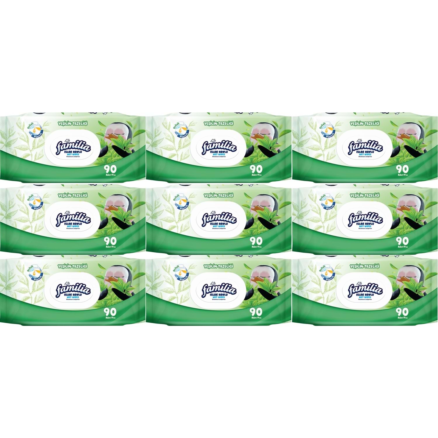 Familia Islak Havlu Mendil Yeşilin Tazeliği 90 Yaprak Plastik Kapaklı 9 Lu Set 810 Yaprak