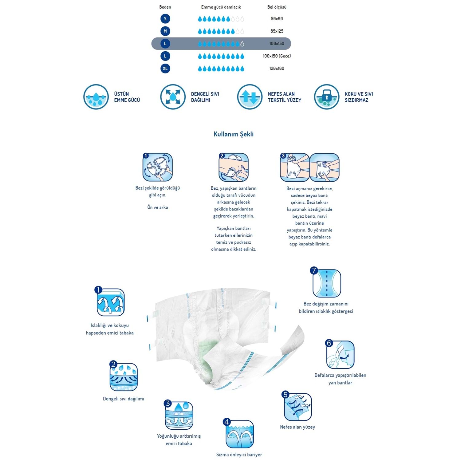 • Yüksek emici tabaka ile uzun süre kuru his sağlar