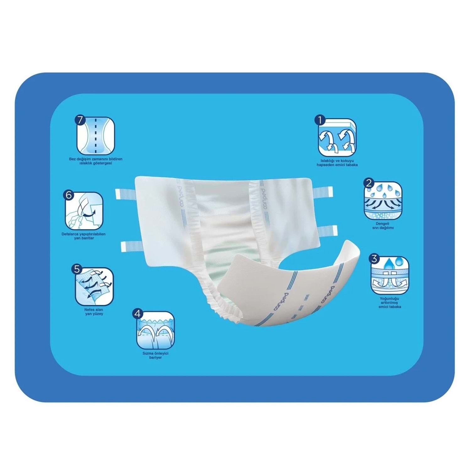 Canped Yetişkin Bel Bantlı Hasta Bezi, orta beden kullanıcılar için güvenli koruma ve yüksek konfor sağlar. Nefes alabilen tekstil yüzeyi sayesinde cildin hava almasına yardımcı olur ve uzun süreli kullanımda bile rahatlık sunar.