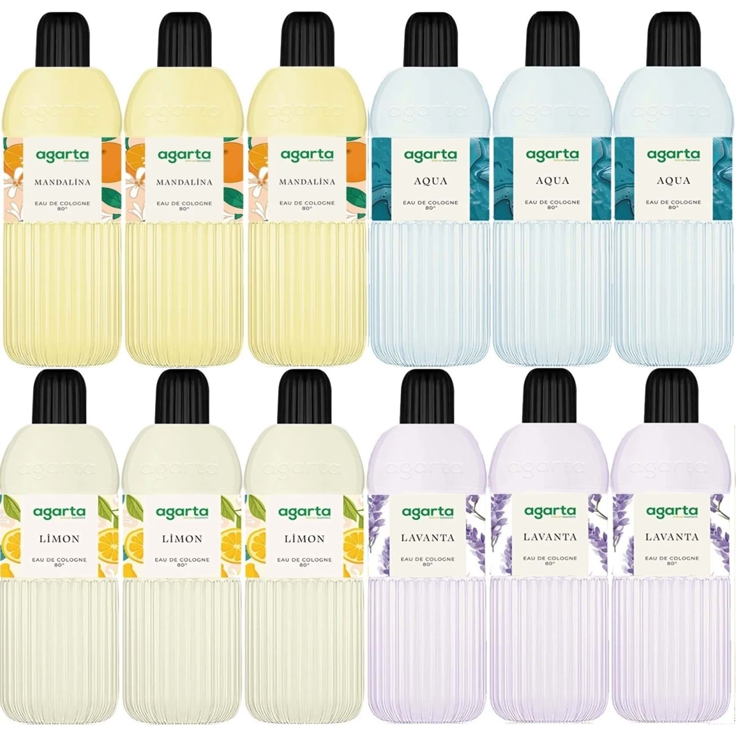 Agarta Kolonya 400 ML 80 Derece Pet Şişe (Mandalina-Aqua-Limon-Lavanta) (12 Li Karma Set)