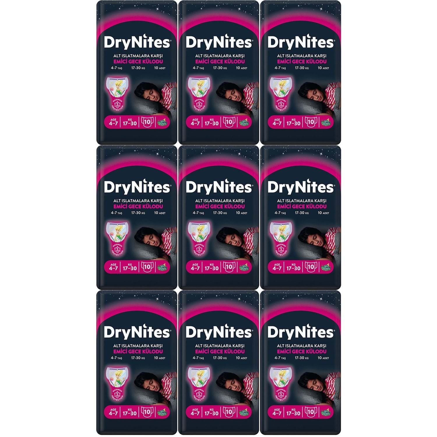 Drynites Emici Gece Külodu/Külot Bez Kız 4-7 Yaş (17-30KG) Large 90 Adet (9PK*10) (Alt Islatmalara Karşı)