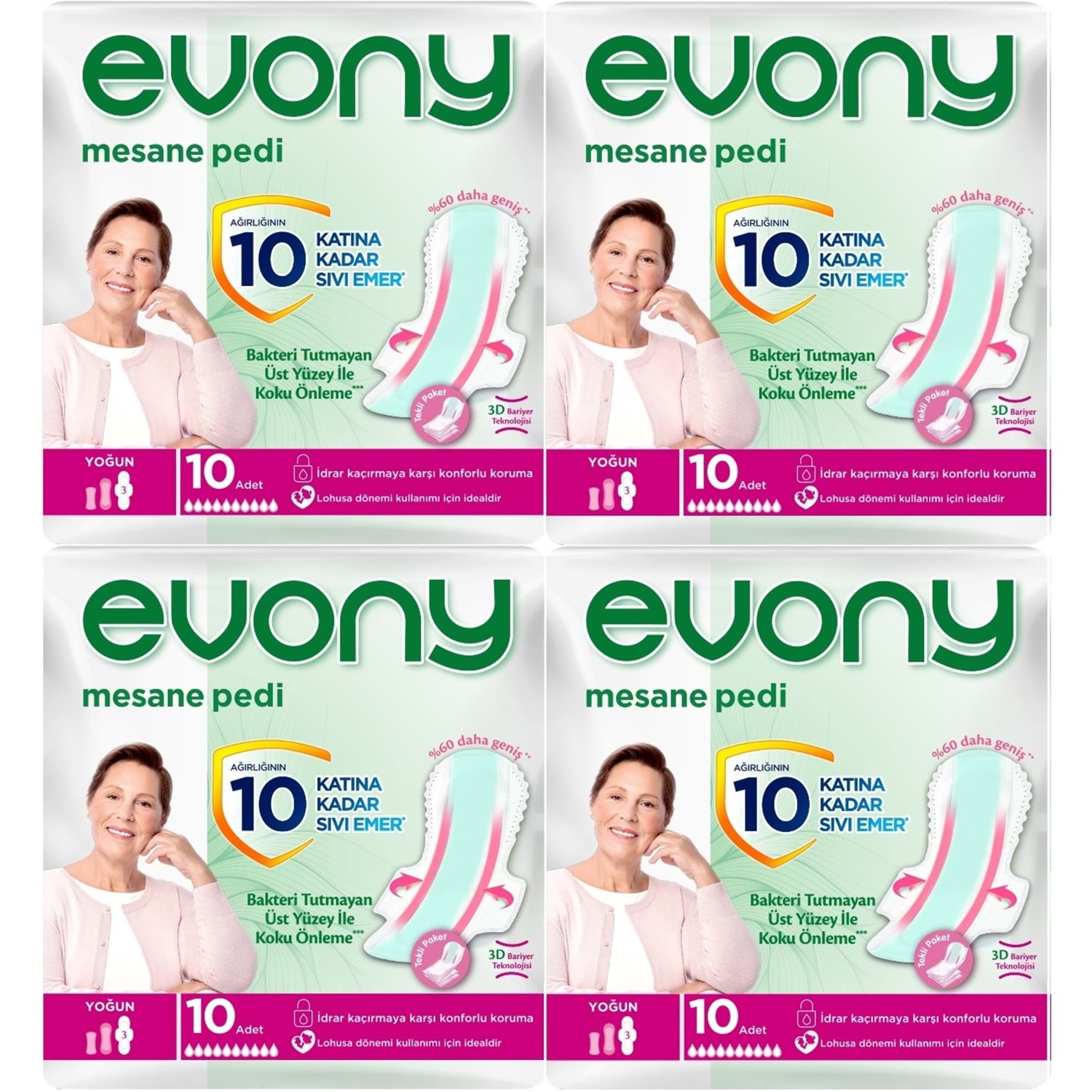 Daha yoğun koruma ihtiyacı olanlar için geliştirilen Evony Yoğun Mesane Pedi ise geniş arka yüzeyi ve 3D bariyer teknolojisi sayesinde sızıntılara karşı ekstra güvenlik sağlar. Kanatlı yapısı ve güçlü yapışkan şeritleri ile çamaşıra tam tutunur, kaymayı önler ve gün boyu sabit kalır.