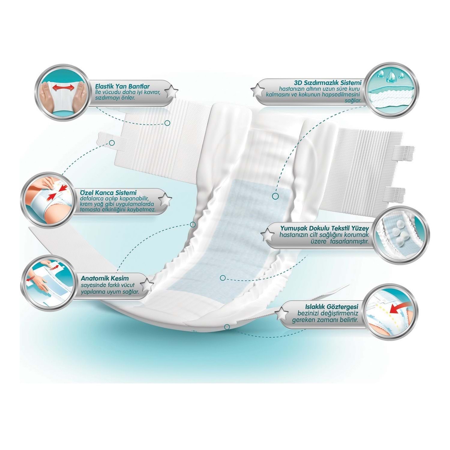 • Yüksek emici tabaka ile sıvıyı hızlı emme ve hapsetme