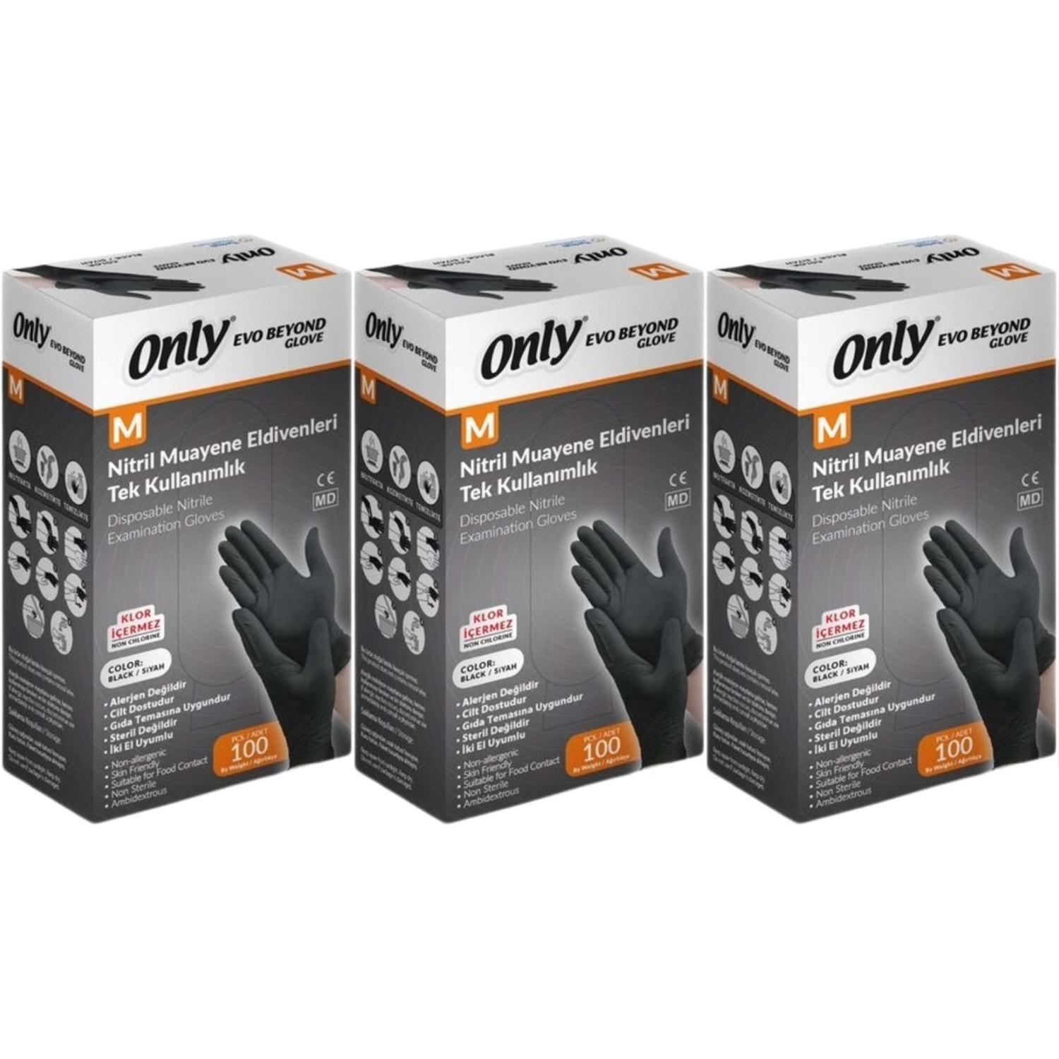 Only Evo Beyond Glove Nitril Siyah Pudrasız Muayene Eldiveni 300 Lü Set M - Medium - Orta (3PK*100)
