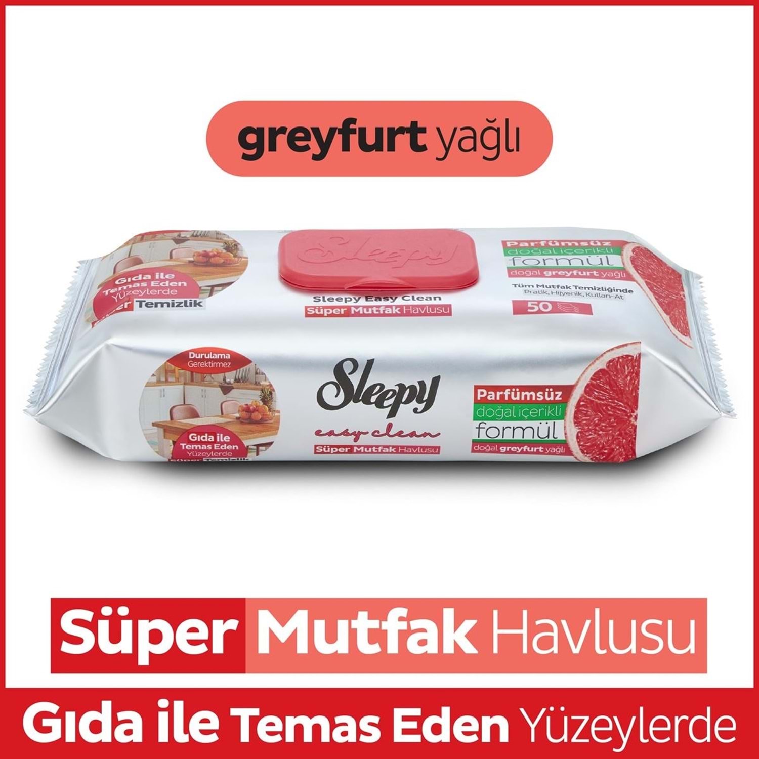 Sleepy Easy Clean mutfak temizlik mendili, doğal greyfurt yağı içeren güçlü formülüyle mutfak yüzeylerinde pratik ve etkili temizlik sağlar. Plastik kapaklı ambalajı sayesinde ilk günkü tazeliğini uzun süre korur.