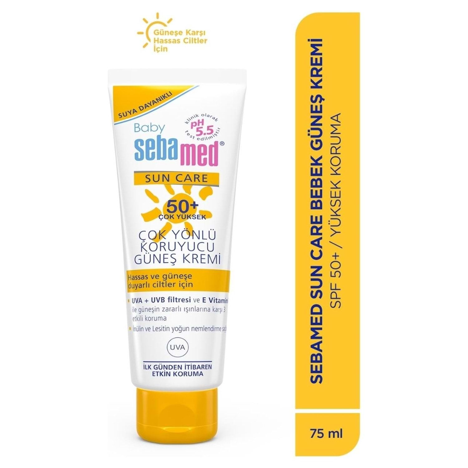 Sebamed Baby Sun Care, bebeklerin hassas cildi için özel olarak geliştirilmiş, çok yüksek koruma faktörlü bir güneş kremidir. SPF 50+ içeriği sayesinde UVA ve UVB ışınlarına karşı güçlü bir koruma sağlar.Suya dayanıklı yapısı ile deniz ve havuz aktiviteleri sırasında da etkili koruma sunar.