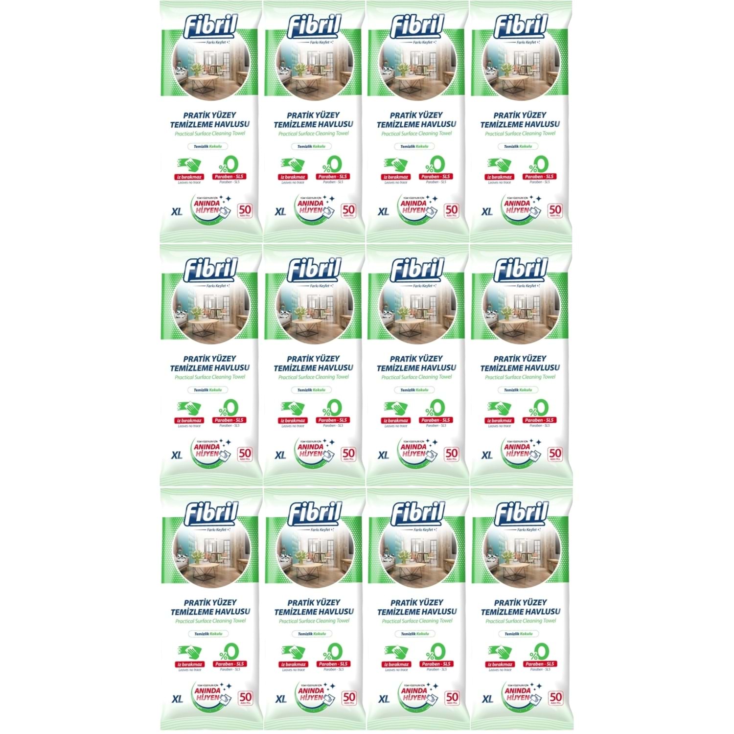Fibril Yüzey Temizlik Havlusu 50 Yaprak XL Temizlik Kokulu 12 Li Set 600 Yaprak Plastik Kapaklı