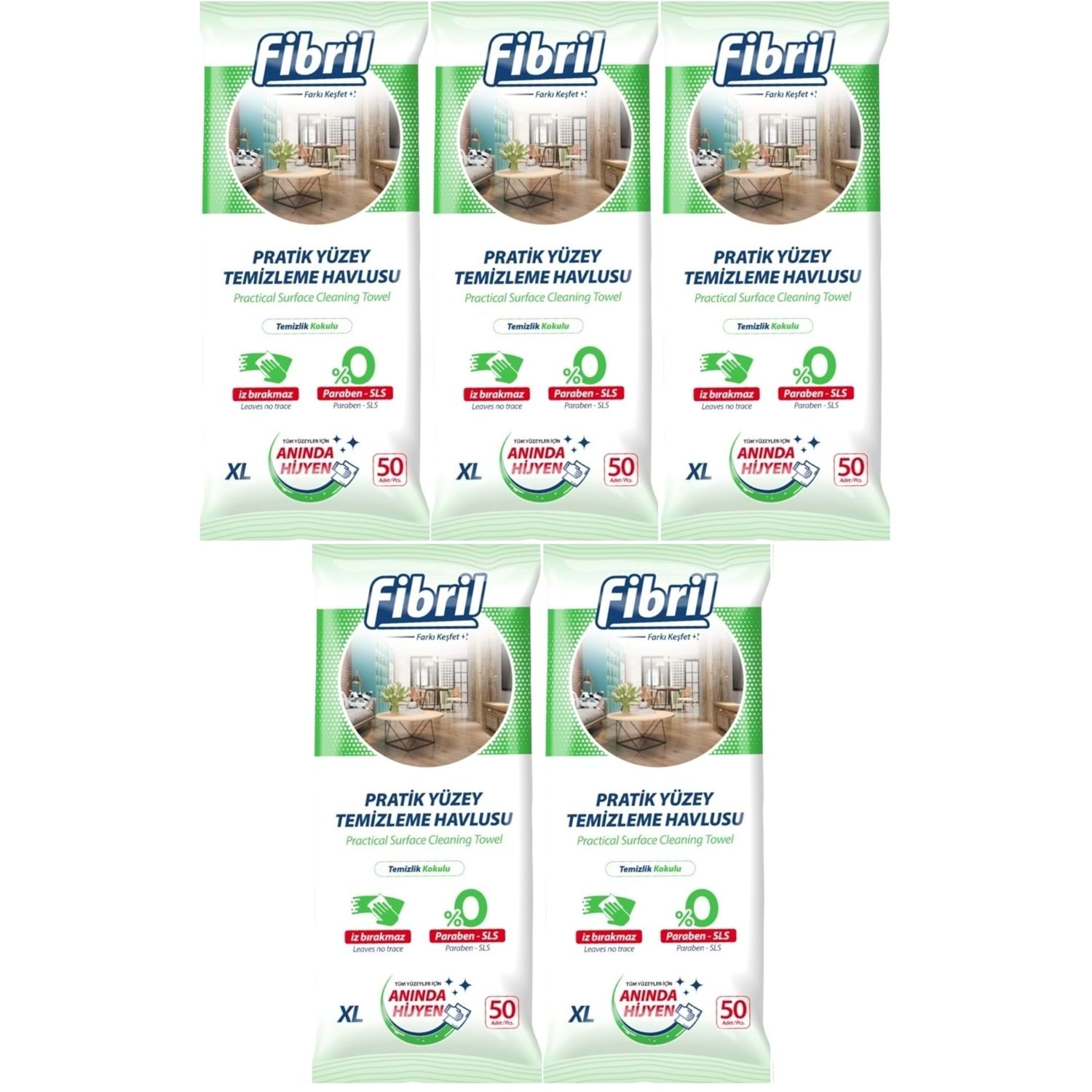 Fibril Yüzey Temizlik Havlusu 50 Yaprak XL Temizlik Kokulu 5 Li Set 250 Yaprak Plastik Kapaklı