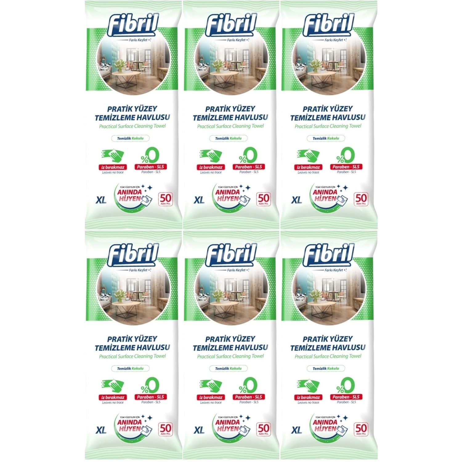 Fibril Yüzey Temizlik Havlusu 50 Yaprak XL Temizlik Kokulu 6 Lı Set 300 Yaprak Plastik Kapaklı